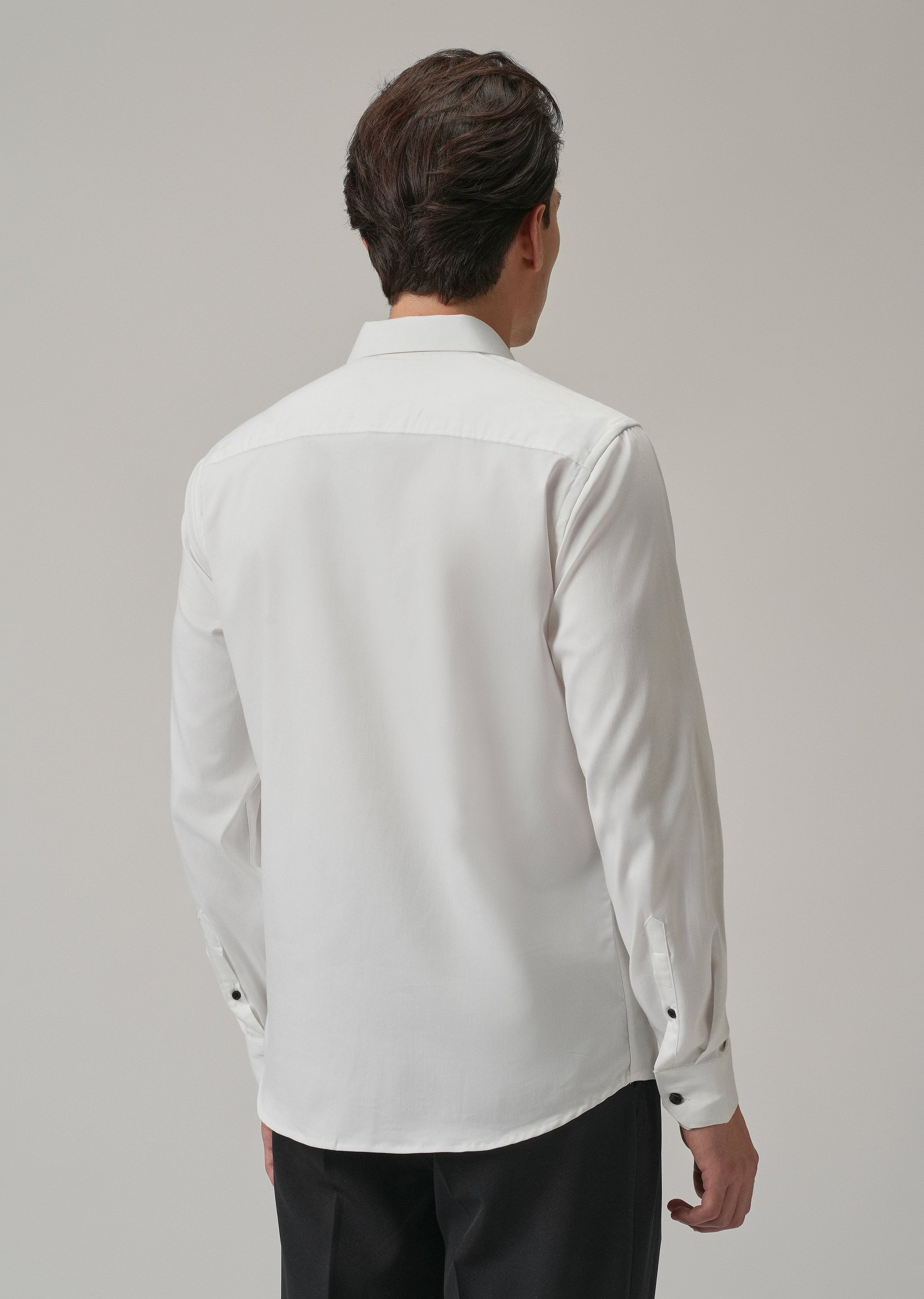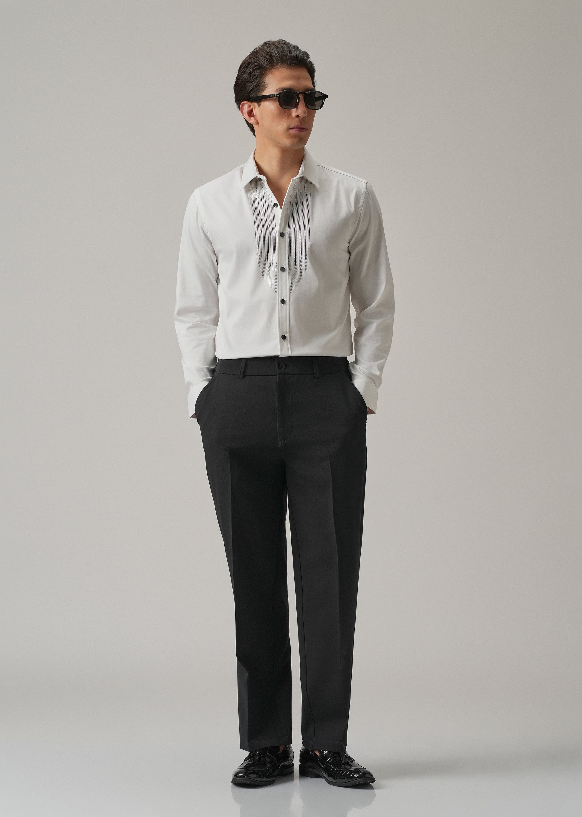 Designed to catch the light, subtly. This shirt features micro hot stud stone work on the front - a modern detail that adds just the right amount of shine. Crafted in a cotton-lycra blend, it’s tailored with a concealed button-up front, curved hem, and a clean collar for everyday versatility.