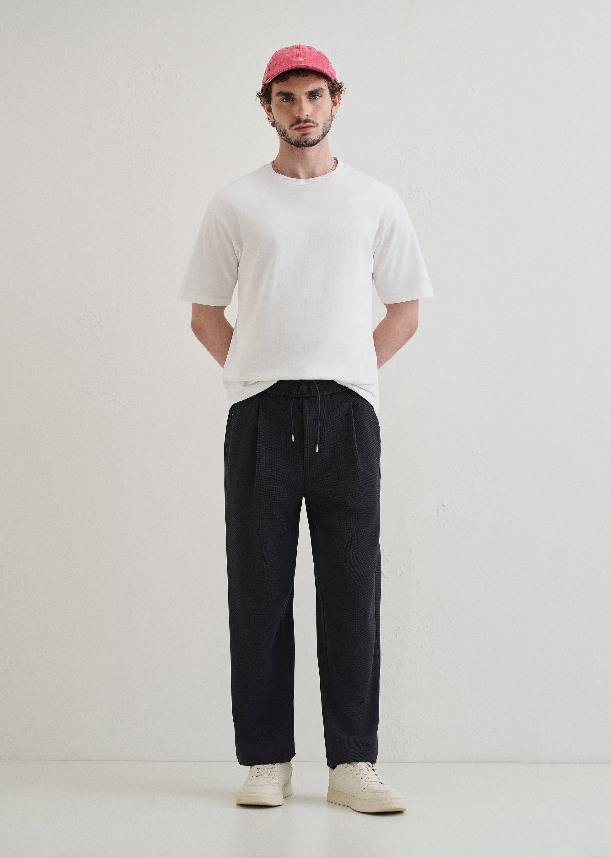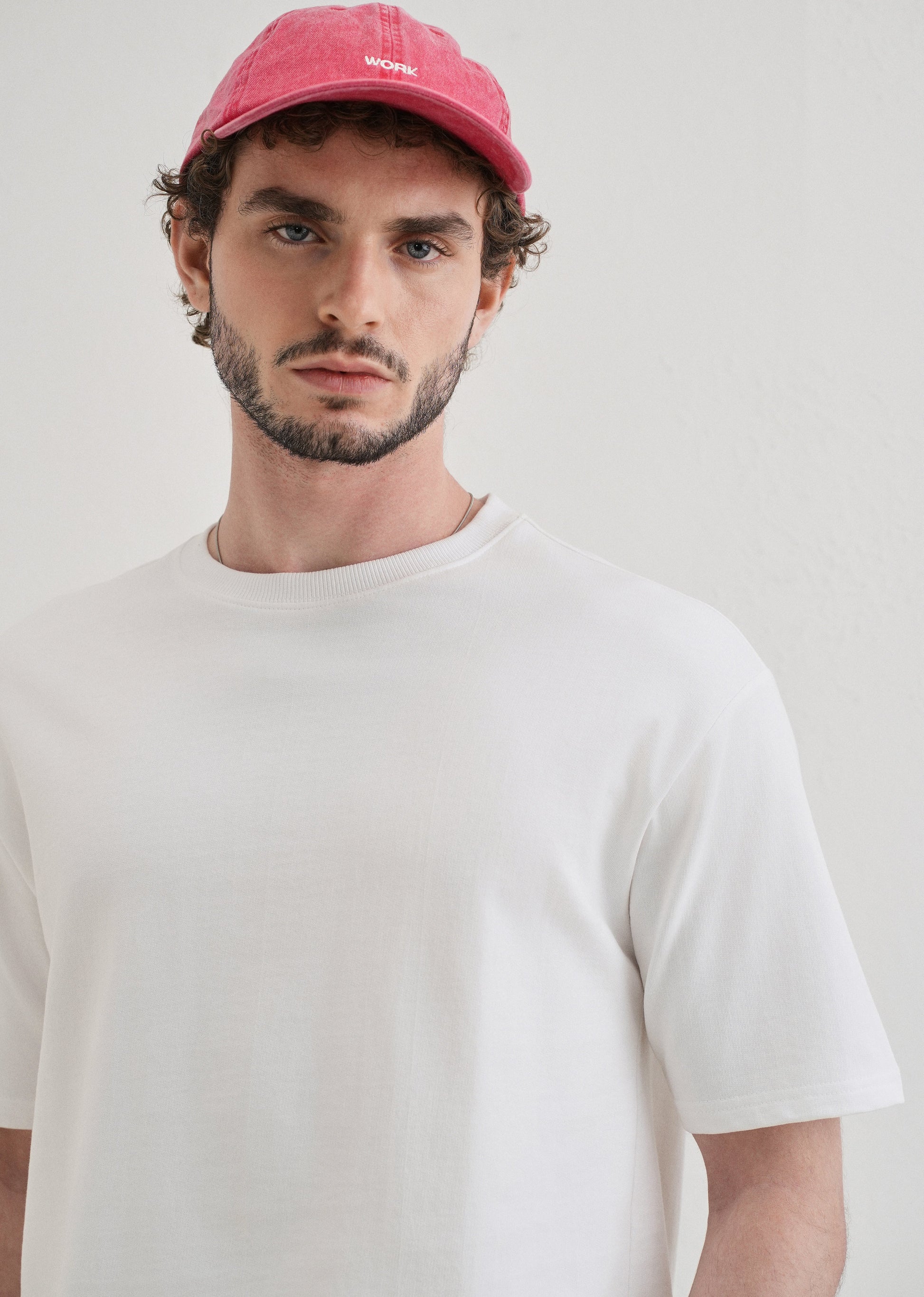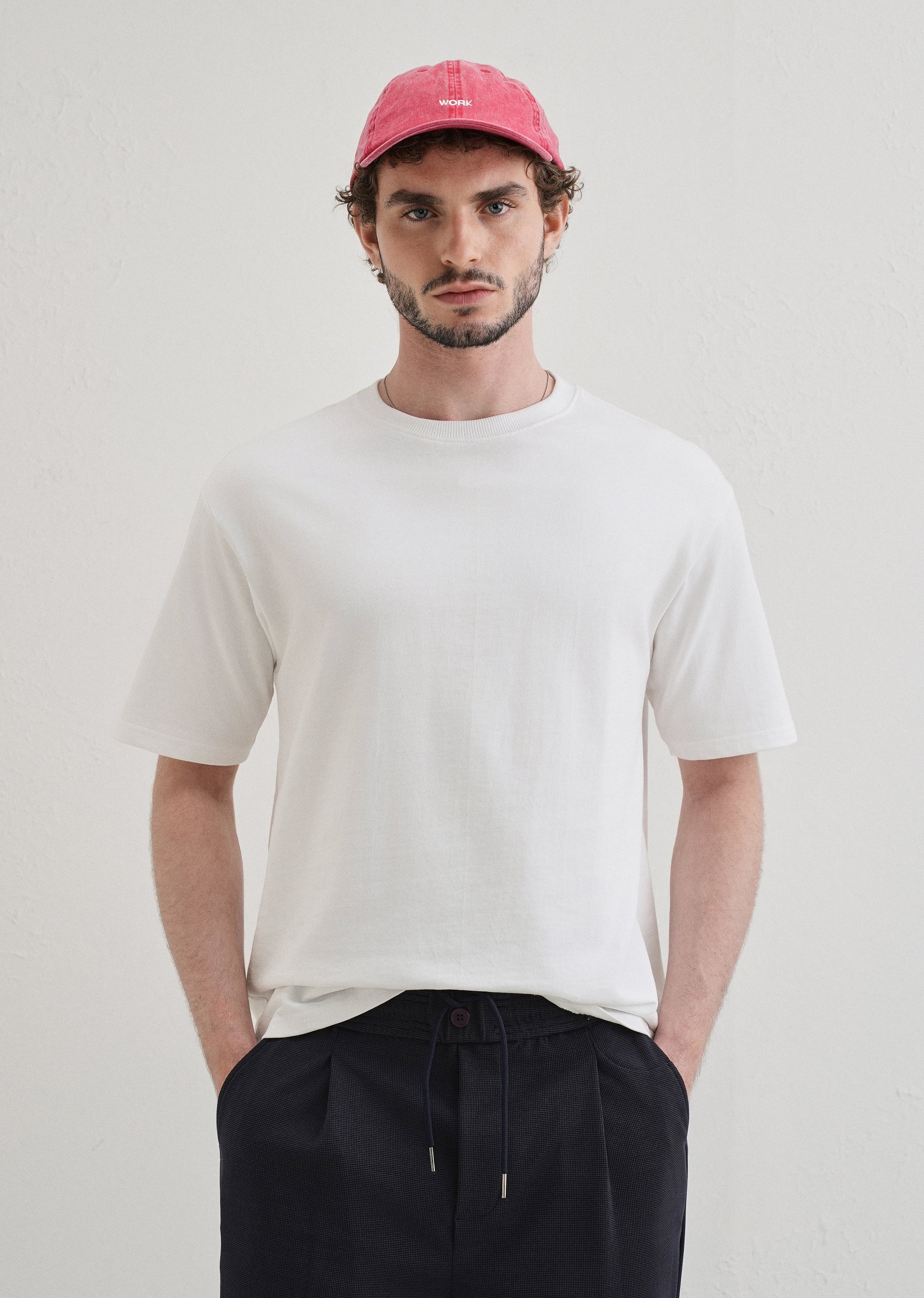 This basic t-shirt features a round crew neckline, drop shoulder sleeves, and a straight hemline, creating a clean and relaxed look. The relaxed fit offers everyday comfort, while the cotton fabric with light stretch ensures breathability and easy movement—making it a versatile piece for casual wear.