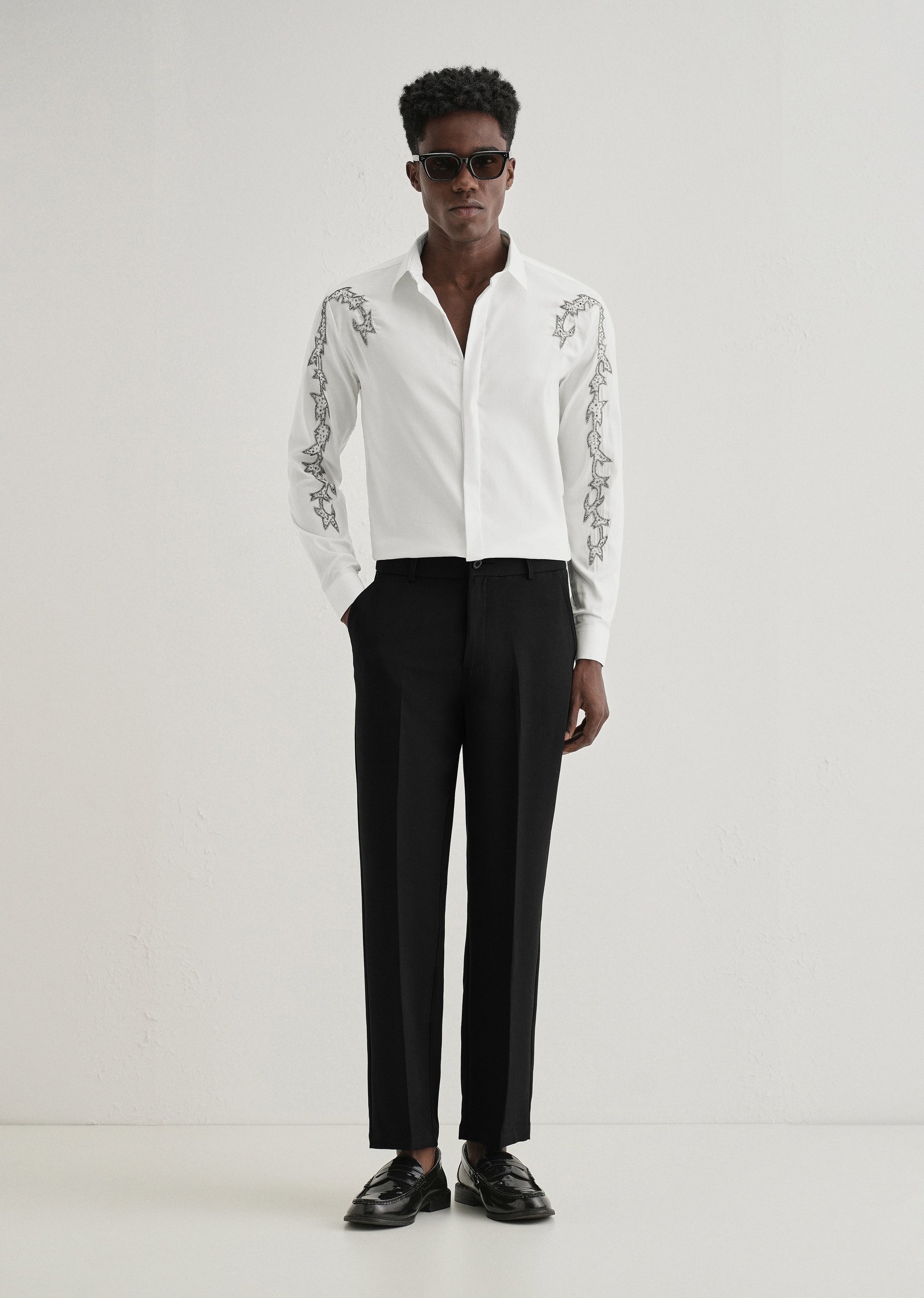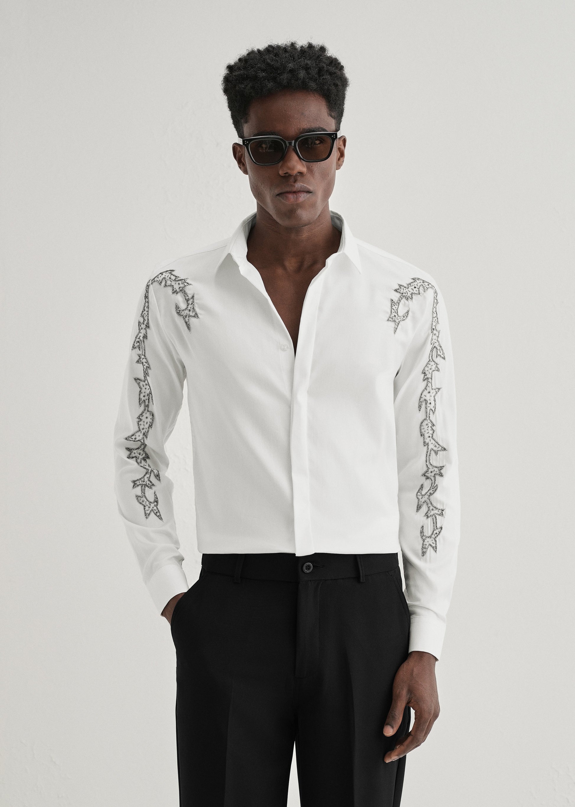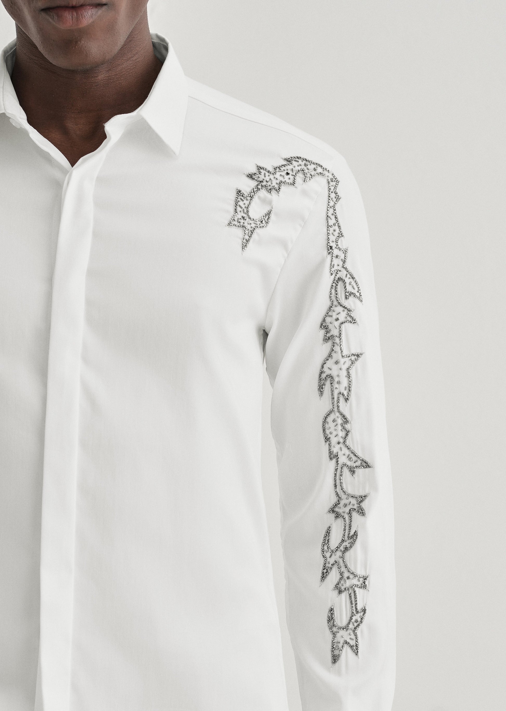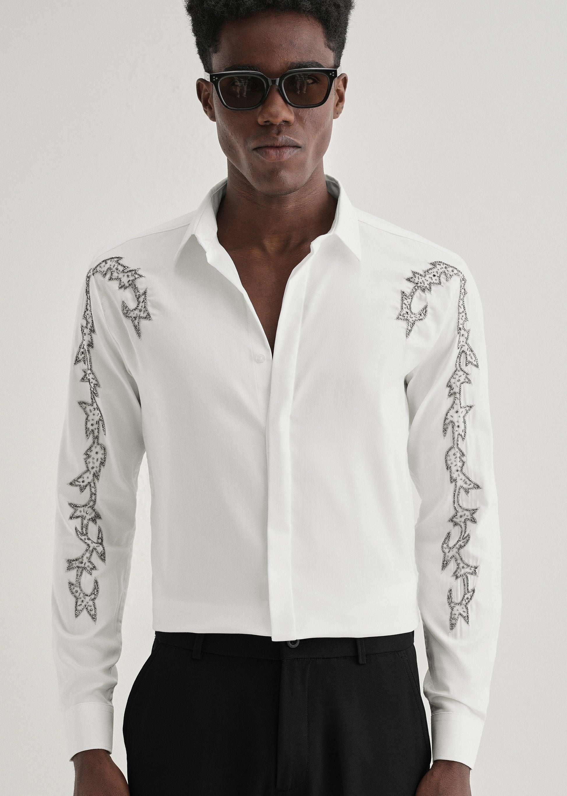 Make a stylish statement with this white shirt featuring silver phoenix embroidery on the sleeves. Made from a soft cotton blend, it offers a comfortable fit and a clean look. The shirt has full sleeves, a spread collar, and a hidden button placket for a sleek finish. Perfect for parties, festive events, or a classy evening out.