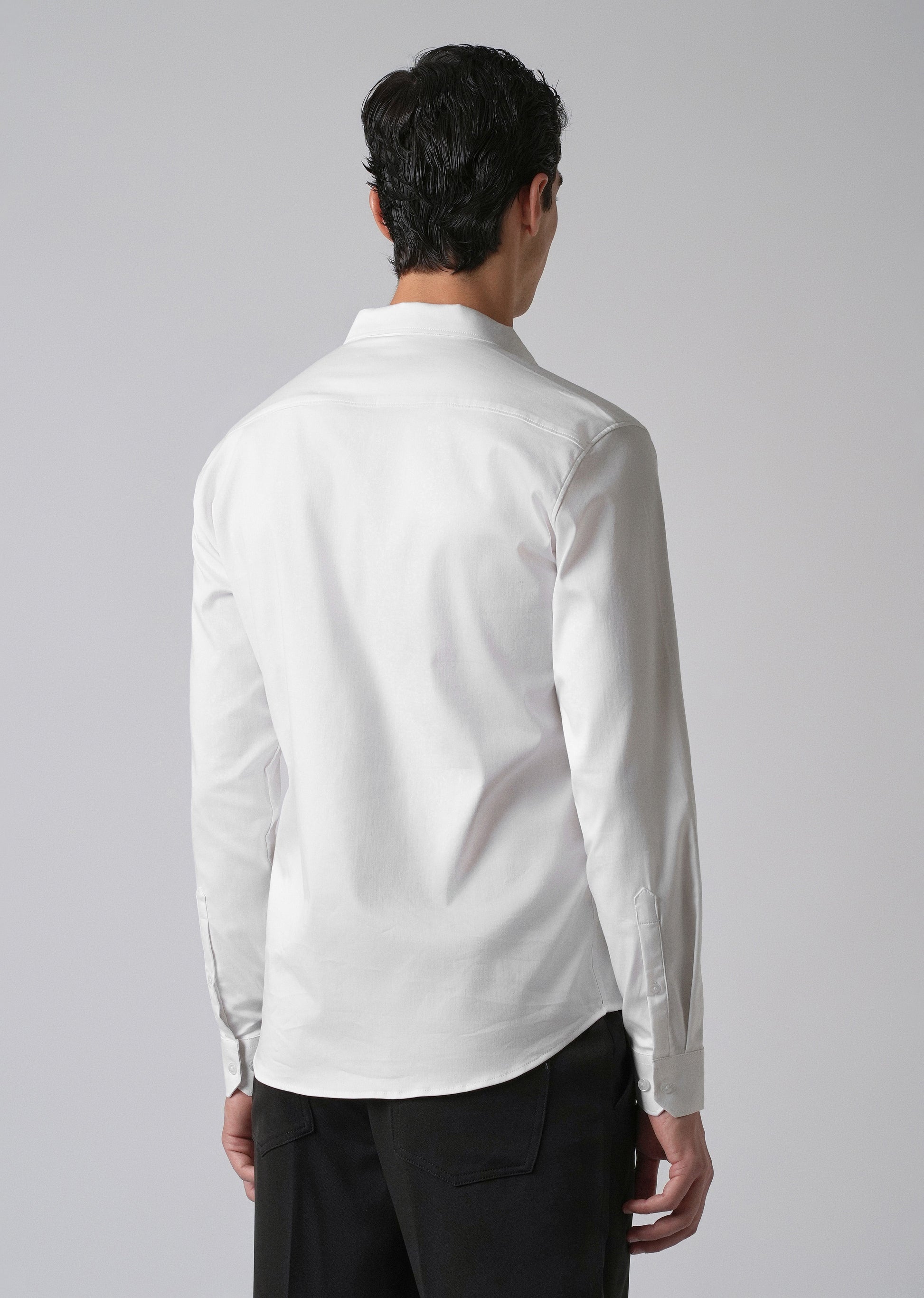 - Curved hem and long sleeves with buttoned cuffs.