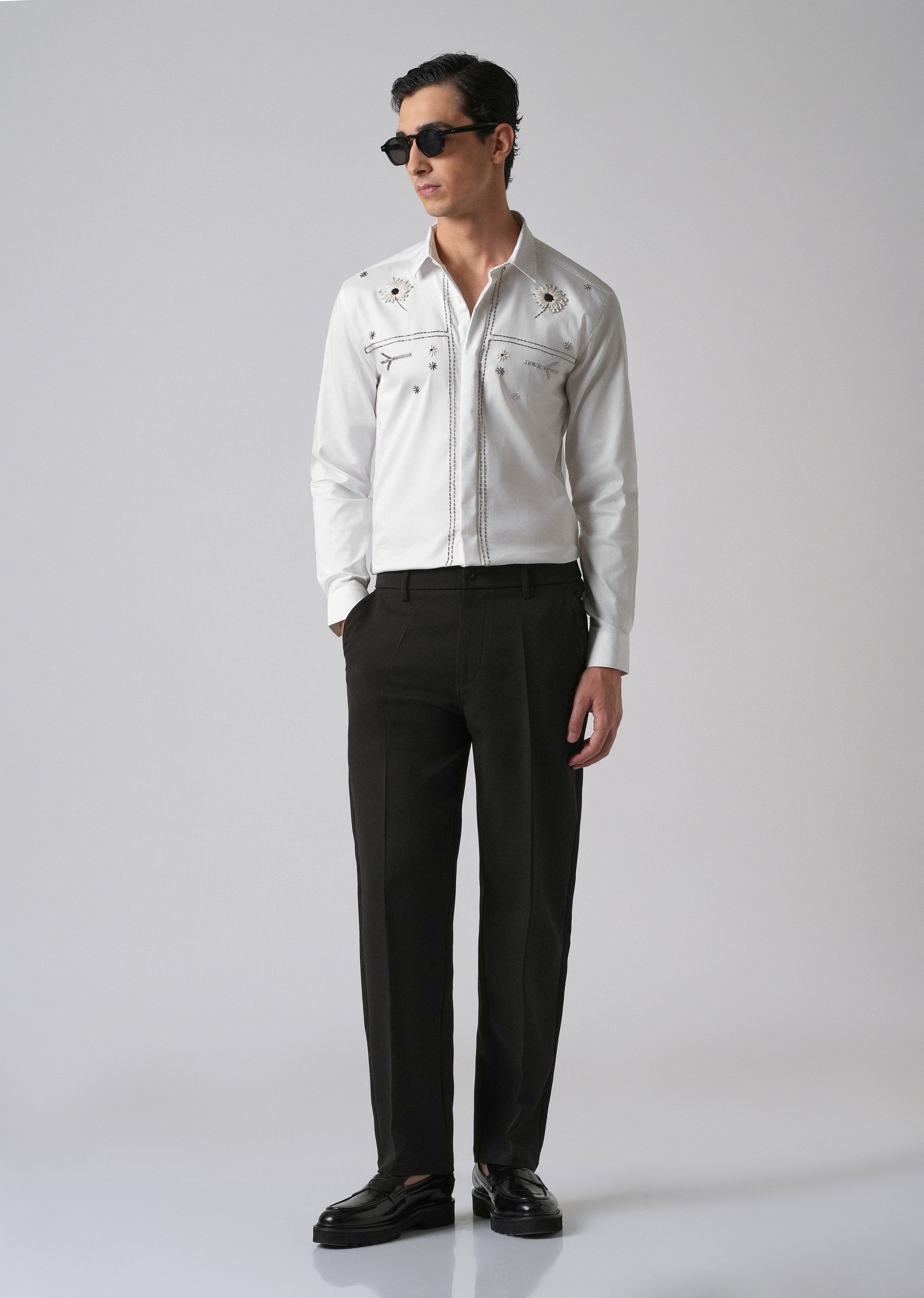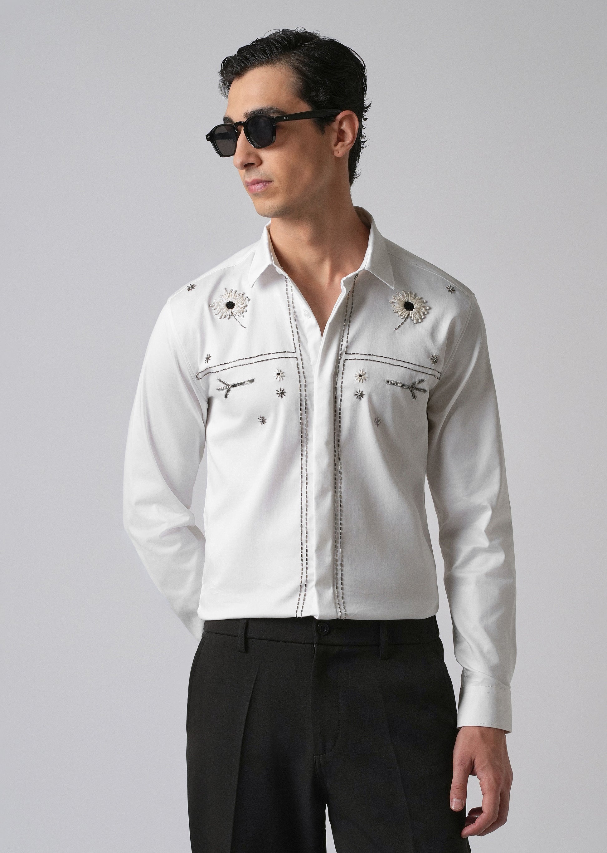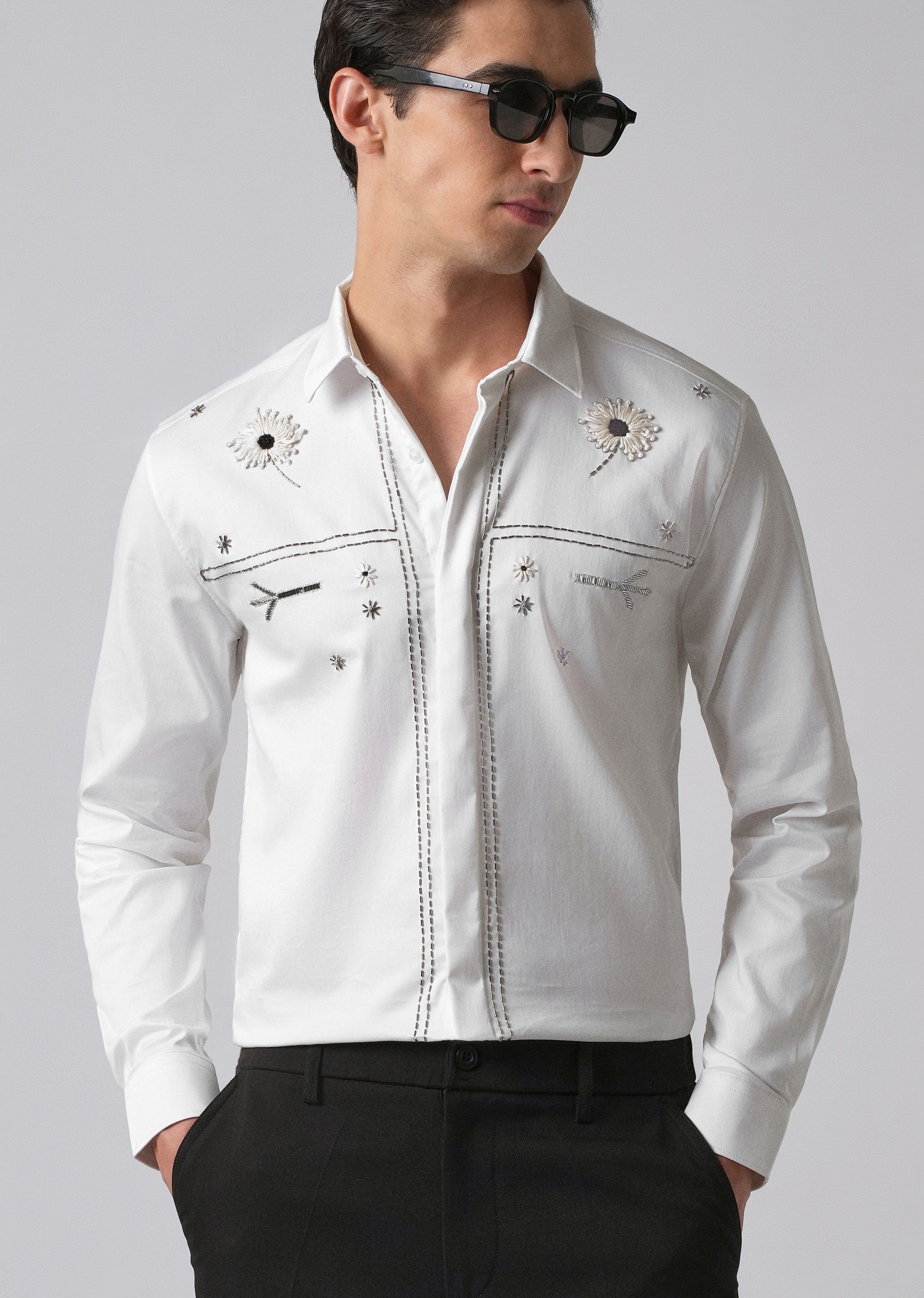 This shirt comes with a classic point collar and a curved hem, along with long sleeves and buttoned cuffs. The front has detailed embroidery with white floral patterns and neat stitching. Silver thread lines run down both sides of the buttons, adding a subtle touch. Made from a soft cotton-Lycra blend, the shirt offers a comfortable slim fit, great for both casual and occasions.