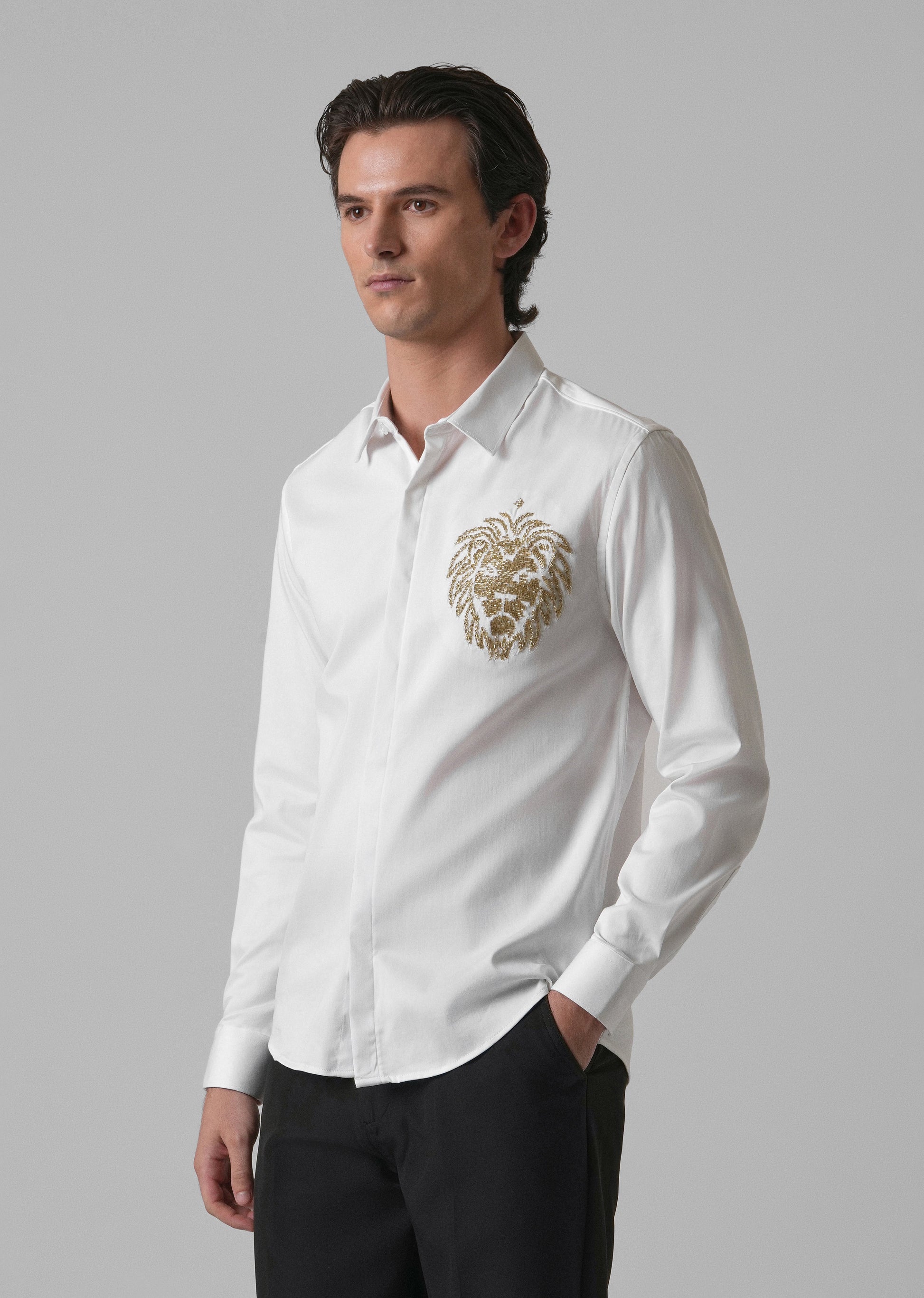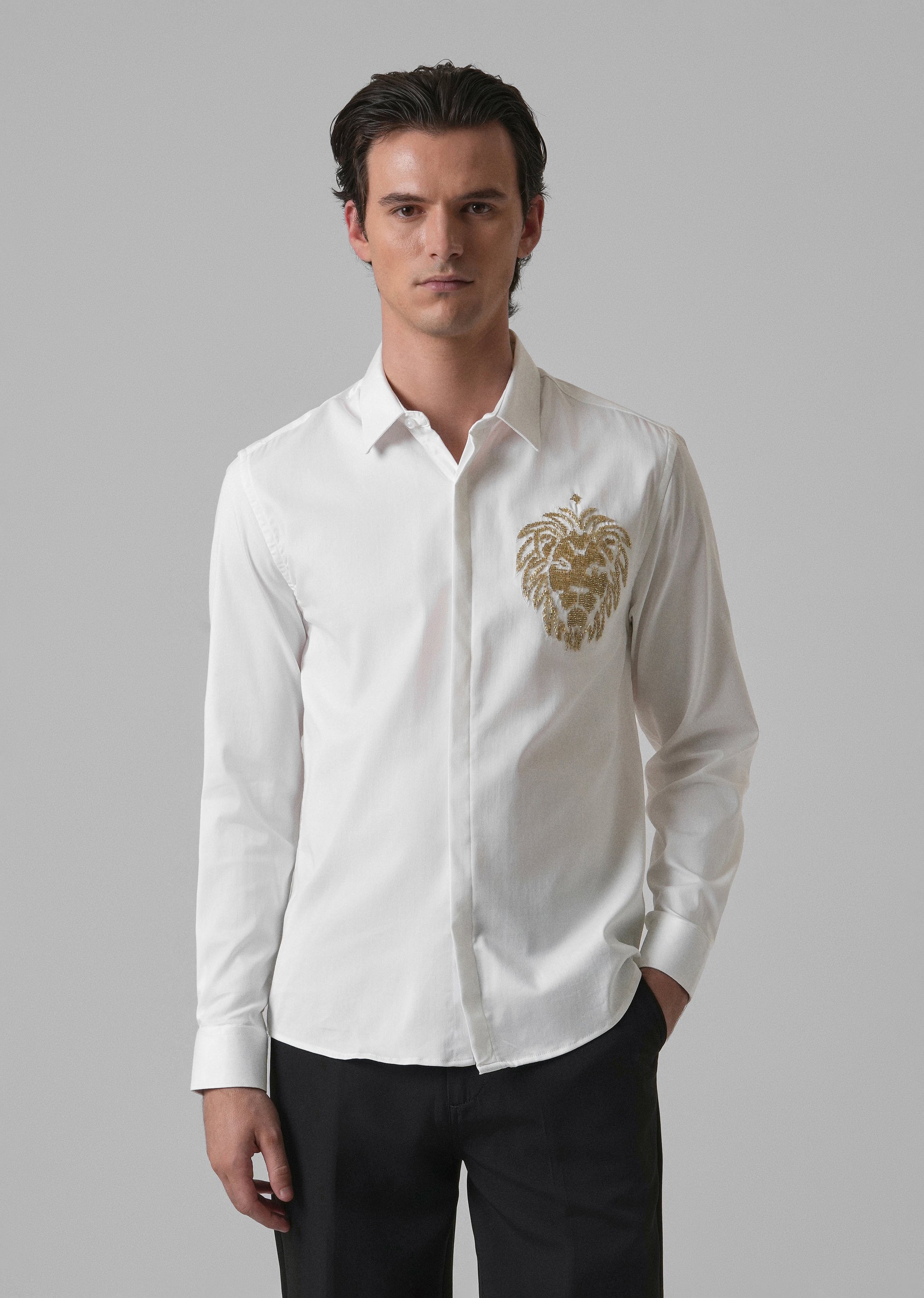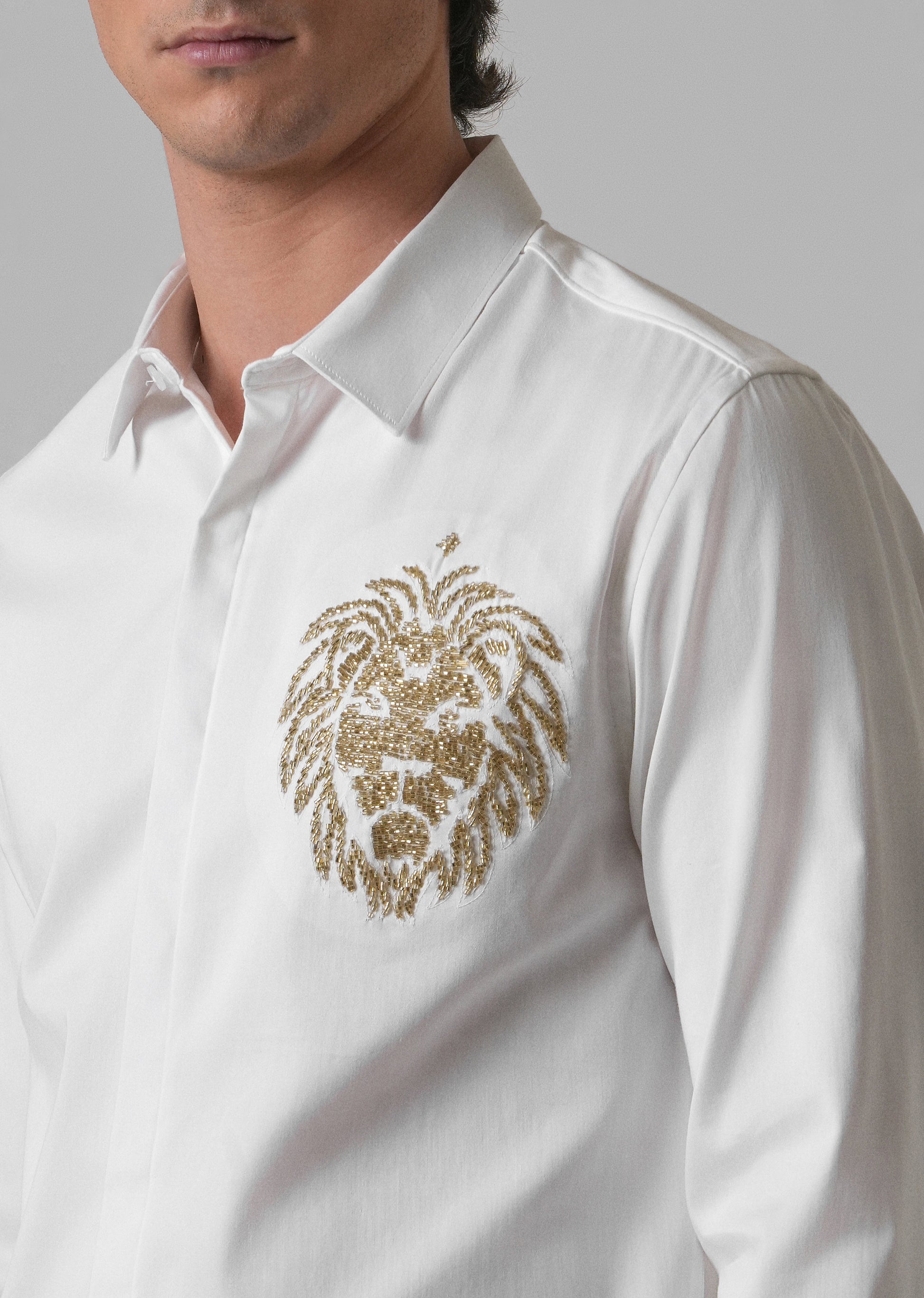 This stylish shirt features a classic point collar with a slight spread, a curved hem, and long sleeves with buttoned cuffs. The standout detail is a bold lion's head design on the chest, made with gold-toned cylindrical bead hand embroidery. Made from a soft cotton-Lycra blend, it offers a comfortable feel and a neat slim fit, perfect for a sharp and modern look.