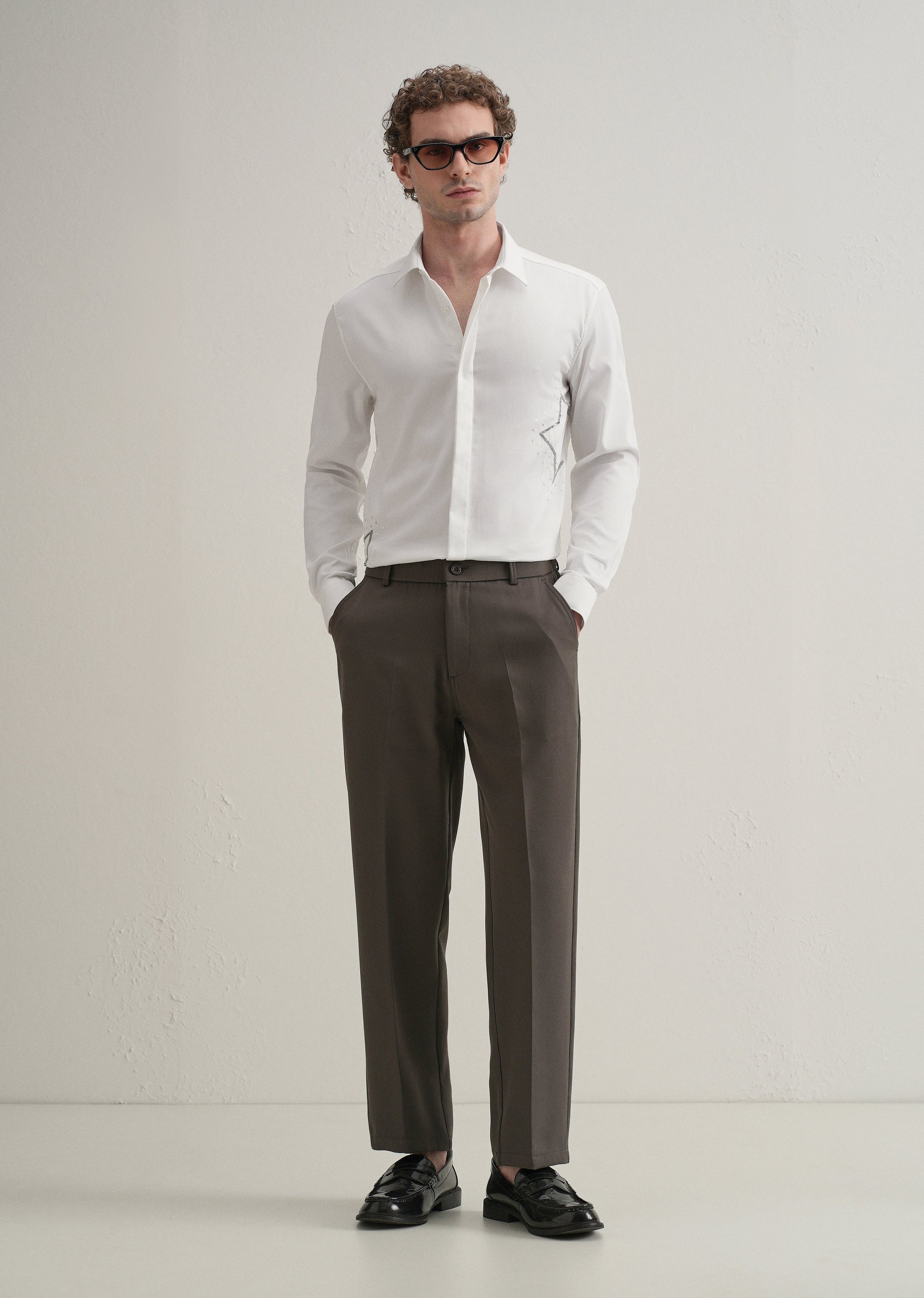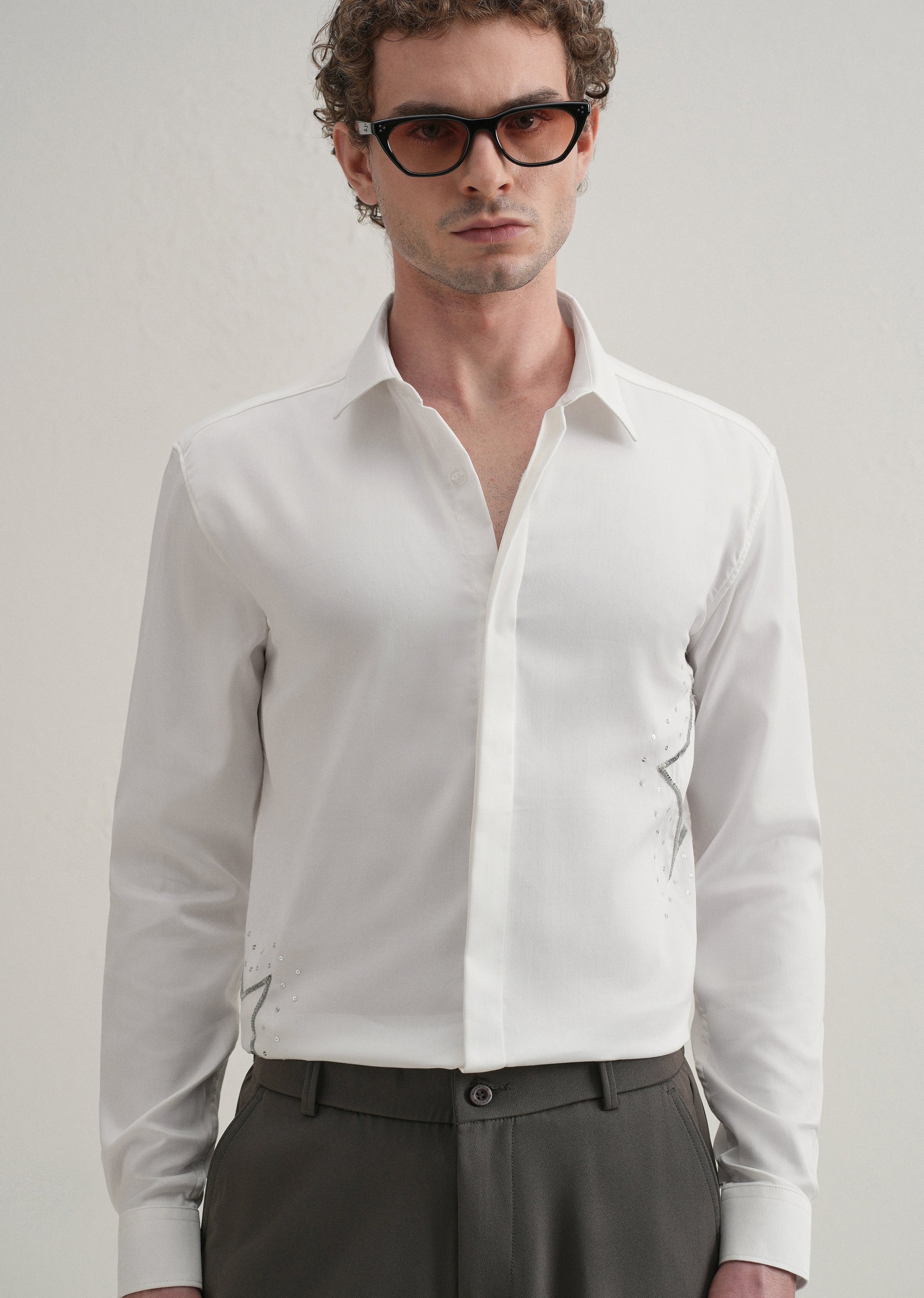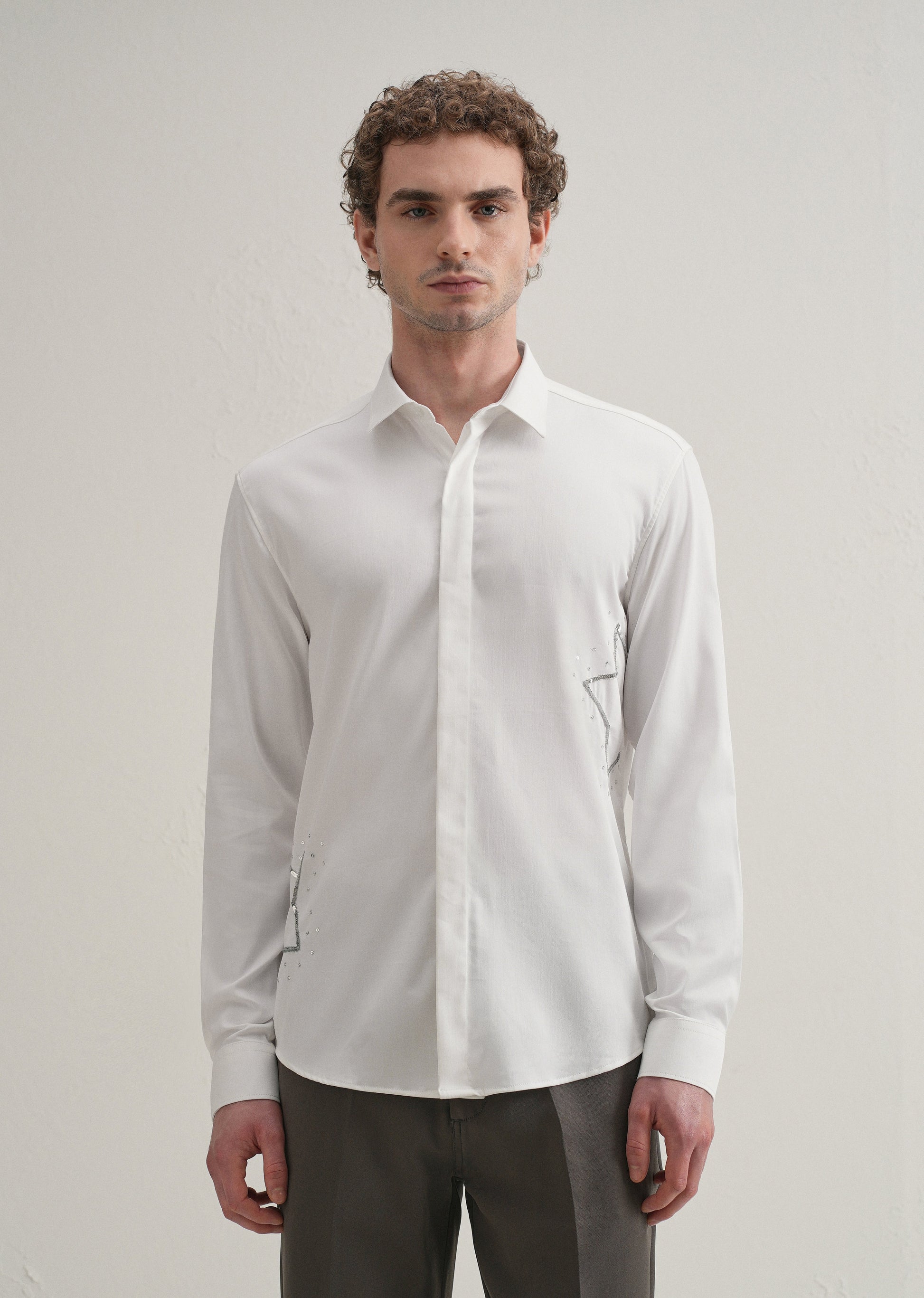 This long-sleeve shirt features a concealed button placket and a classic pointed collar for a clean, refined look. Embroidered star motifs with scattered dot accents arranged in a sequence add a distinctive design detail. The curved hemline lends a casual touch, while the blend of 62% cotton, 35% polyester, and 3% spandex ensures comfort, durability, and a hint of stretch.